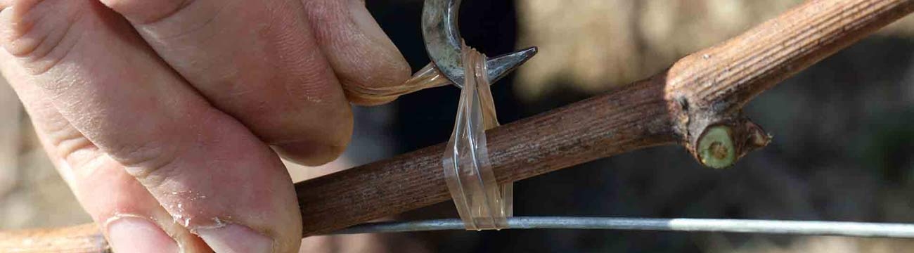 Une fois le cep de vigne taillé, le bois qui constitue la charpente doit être attaché au fil de support pour que la plante développe des brins afin de bénéficier d'un meilleur ensoleillement.